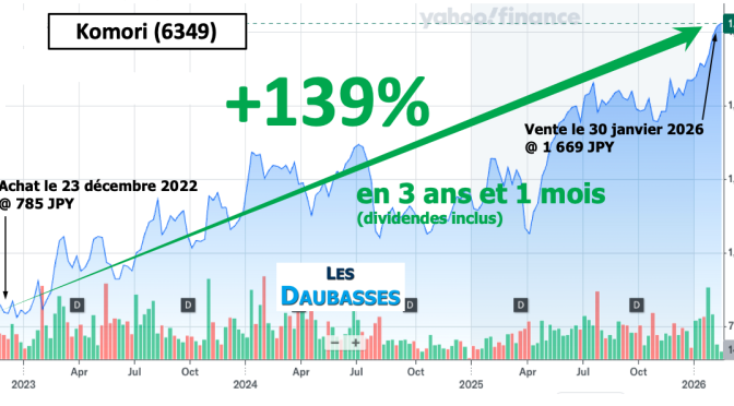 Dans un marché japonais en pleine effervescence, nous avons vendu une ligne du Portefeuille daubasses 2 suite à l’atteinte de notre objectif de cours (déjà la 4ème vente gagnante depuis le 1er janvier !).