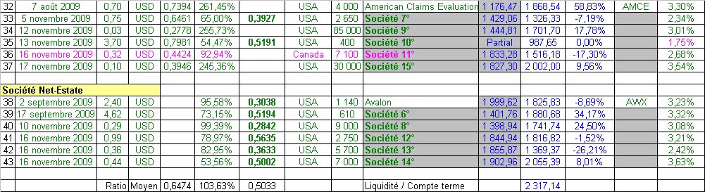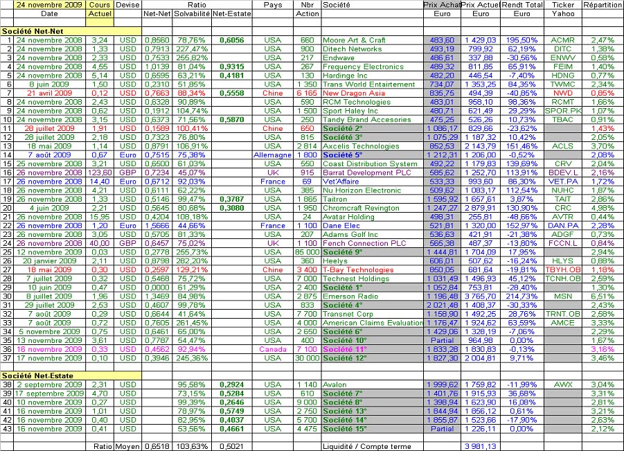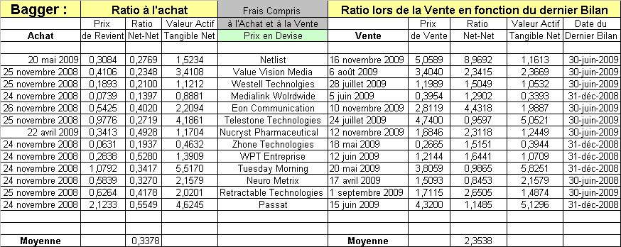 Vous pourrez à notre avis surtout constater que les ratio Net-Net des deux portefeuilles sont bien différents. Le portefeuille de départ sans arbitrage aurait aujourd’hui un ratio Net-Net Moyen de 0.9798…..Notre portefeuille actuel a quand à lui un ratio Net-Net moyen de 0.6518.