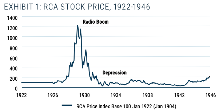 Au XIXe siècle, les chemins de fer ont suscité une euphorie immense : ils révolutionnaient le transport des personnes et des marchandises, et certains y voyaient déjà un monde unifié. Au début du XXe siècle, la radio et la technologie sans fil ont provoqué un emballement similaire, illustré par la flambée du titre RCA (Radio Corporation of America) pendant les années 1920.