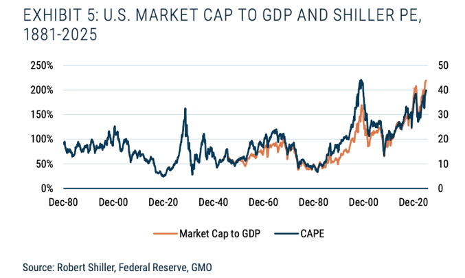 Le ratio CAPE du marché américain (capitalisation boursière du S&P 500 / résultat net sur 10 ans ajusté de l’inflation), dont la moyenne depuis 1880 est d’environ 17,6, a atteint 32,6 avant le krach de 1929, puis un record historique de 43,5 au sommet de la bulle internet en 2000. En 2021, lors de l’« Everything Bubble », il est monté à 38,6.