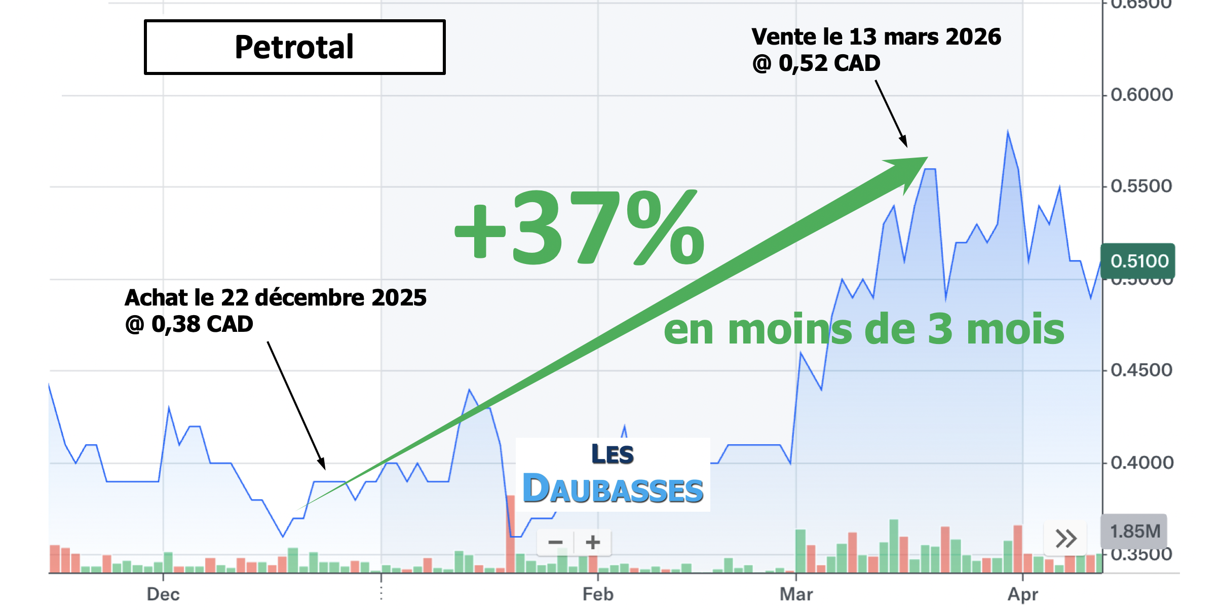Petrotal a embarqué dans la Pirogue d’Okavongo le 22 décembre 2025 au cours de 0,38 CAD. Cette opération s’inscrivait dans une logique de rotation de sous-jacents chers (comme l’or) vers des sous-jacents moins chers.